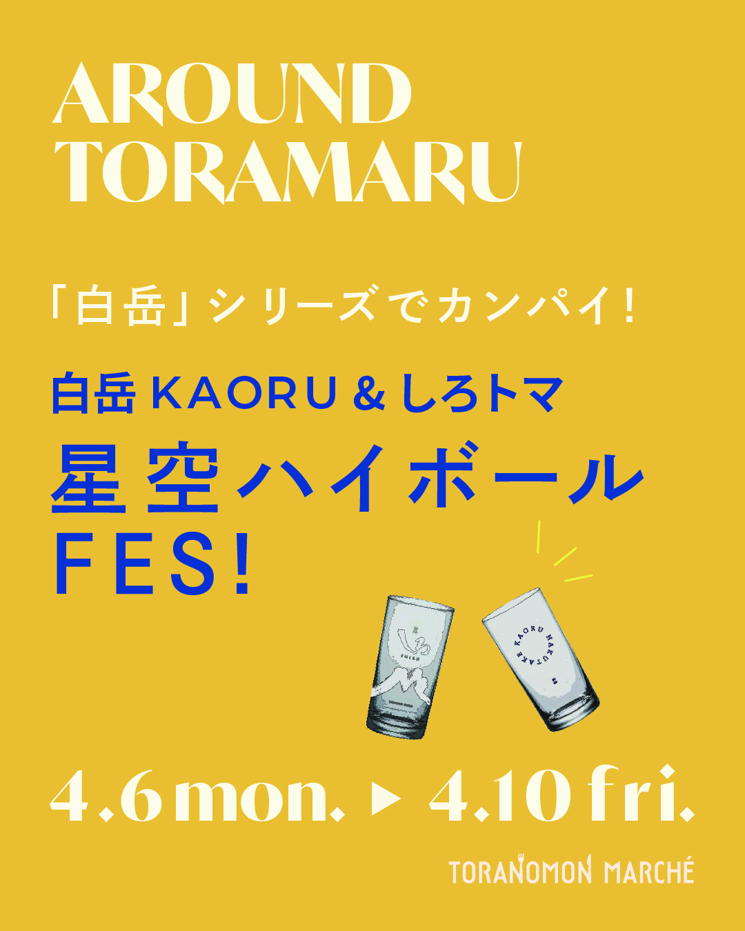 このたび、4月6日(月)から4月10日(金)の期間中、虎ノ門アルセアタワー1階『TORANOMON MARCHE』にて「白岳KAORU&しろトマ 星空ハイボールFES!」を開催いたします。